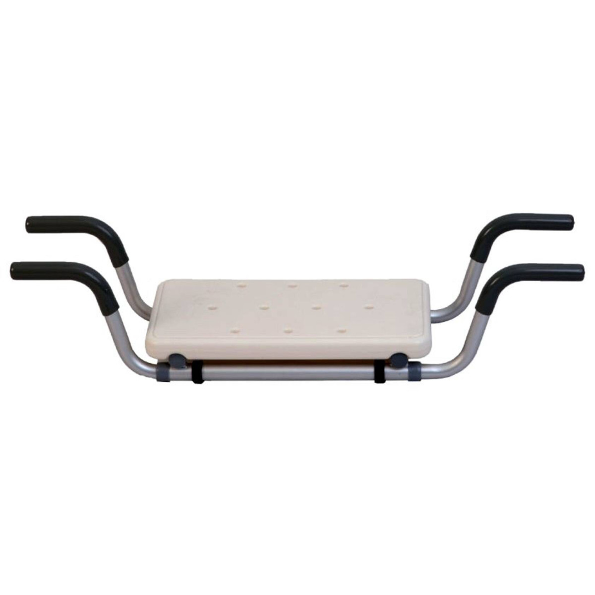 Sedile per vasca da bagno con seduta antiscivolo in polietilene con fori per il deflusso dell’acqua. Regolabile in larghezza e con appoggi alla vasca rivestiti di gomma, il telaio è in alluminio.