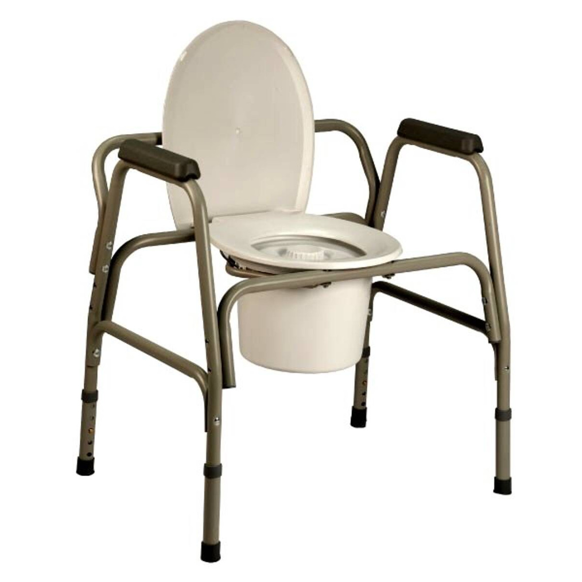 L'ausilio è dotato di sedile regolabile in altezza (da 45,6 a 56 cm) per facilitare la seduta e l'alzata, e di braccioli ergonomici in plastica per un appoggio sicuro. Il secchio estraibile è completo di manico, coperchio e convogliatore, assicurando massima igiene e praticità. I puntali in gomma antiscivolo garantiscono una tenuta perfetta su ogni pavimento, supportando un peso massimo di 225 kg.