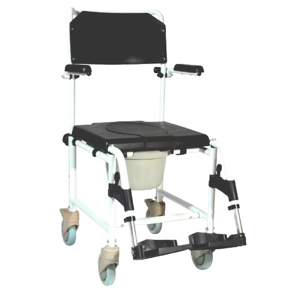 Il dispositivo è estremamente manovrabile grazie alle quattro ruote piroettanti da 12,5 cm, dotate di bloccaggio sulle posteriori per lo stazionamento sicuro sopra il WC o sotto il getto della doccia. Il sedile presenta una parte anteriore rimovibile per facilitare l'igiene intima, mentre le pedane sono regolabili in altezza, ribaltabili e rimovibili. Completa l'ausilio il secchio estraibile con manico e coperchio incluso nella dotazione.