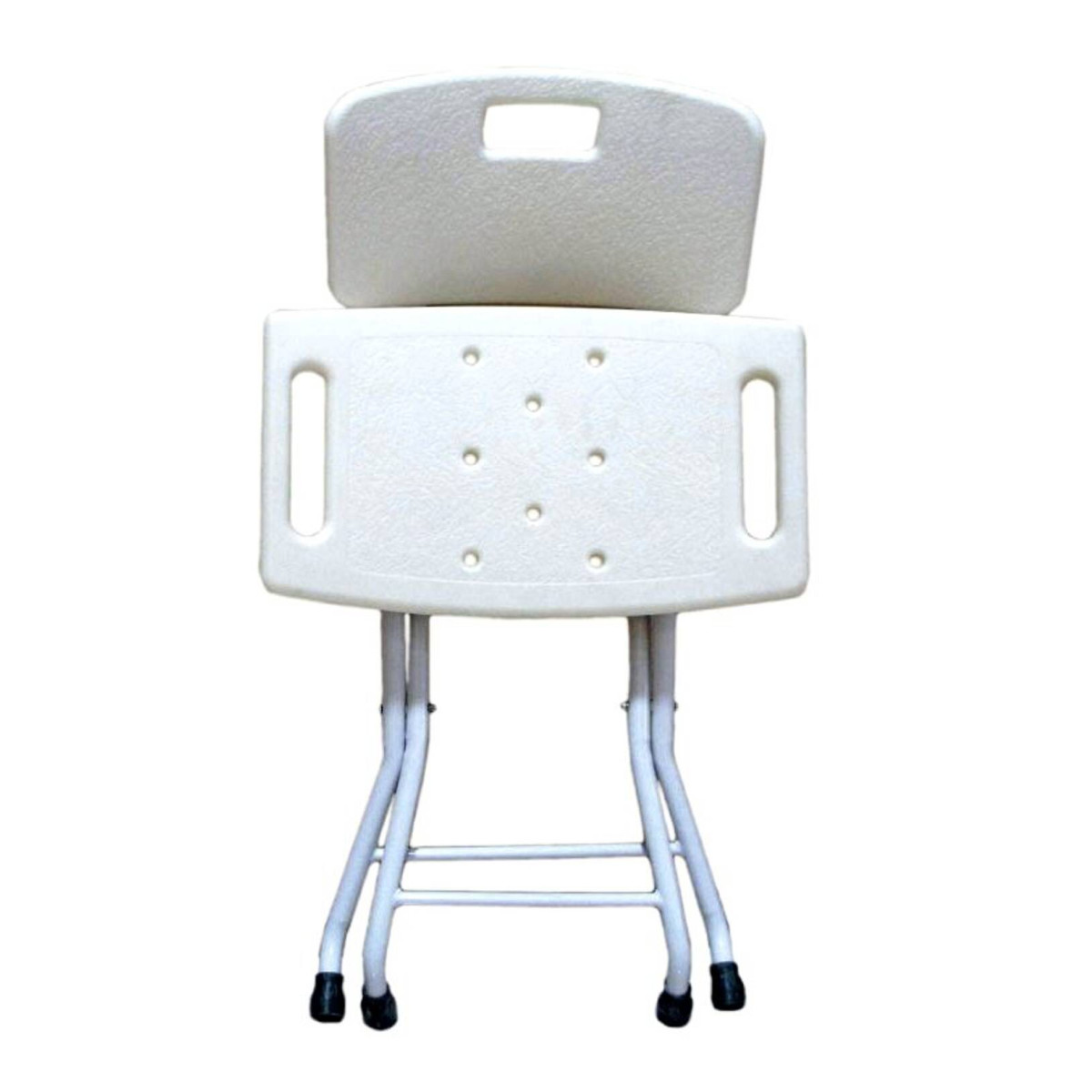 Sia la seduta che lo schienale sono realizzati in materiale plastico ad alta densità con superficie antiscivolo e fori per il deflusso dell'acqua. La sicurezza è potenziata dalle maniglie integrate (due sulla seduta e una sullo schienale) che agevolano la presa e i trasferimenti. Il telaio in acciaio verniciato bianco garantisce solidità, mentre i puntali in gomma assicurano un'aderenza perfetta.