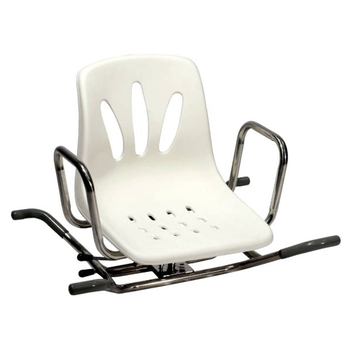 Il sedile è dotato di comodi braccioli che offrono un supporto stabile durante la rotazione e la seduta. Per garantire una stabilità assoluta, la struttura dispone di battute laterali di sicurezza che bloccano la sedia una volta posizionata, mentre gli appoggi sono rivestiti in gomma antiscivolo per proteggere lo smalto della vasca. È un supporto indispensabile per chi desidera mantenere l'autonomia quotidiana con il massimo comfort.