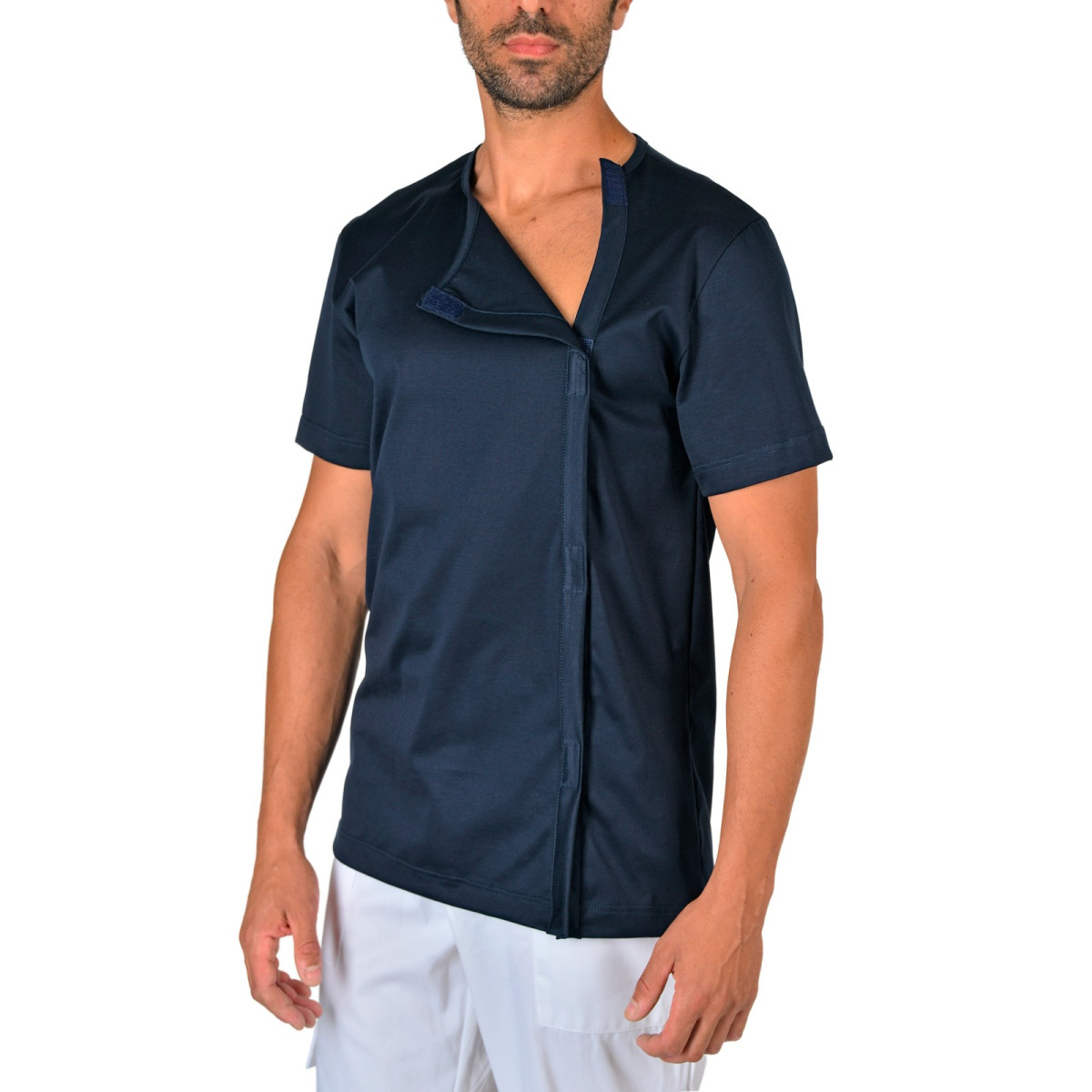 La T-shirt Art.1032 rappresenta una soluzione di eccellenza nell'intimo ospedaliero, progettata da ParamedicalShop e realizzata interamente in Italia (Made in Italy). Il pregiato jersey di puro cotone Filo di Scozia assicura il massimo benessere sulla pelle, mentre l'apertura strategica con velcro sul lato cuore facilita drasticamente la vestizione.