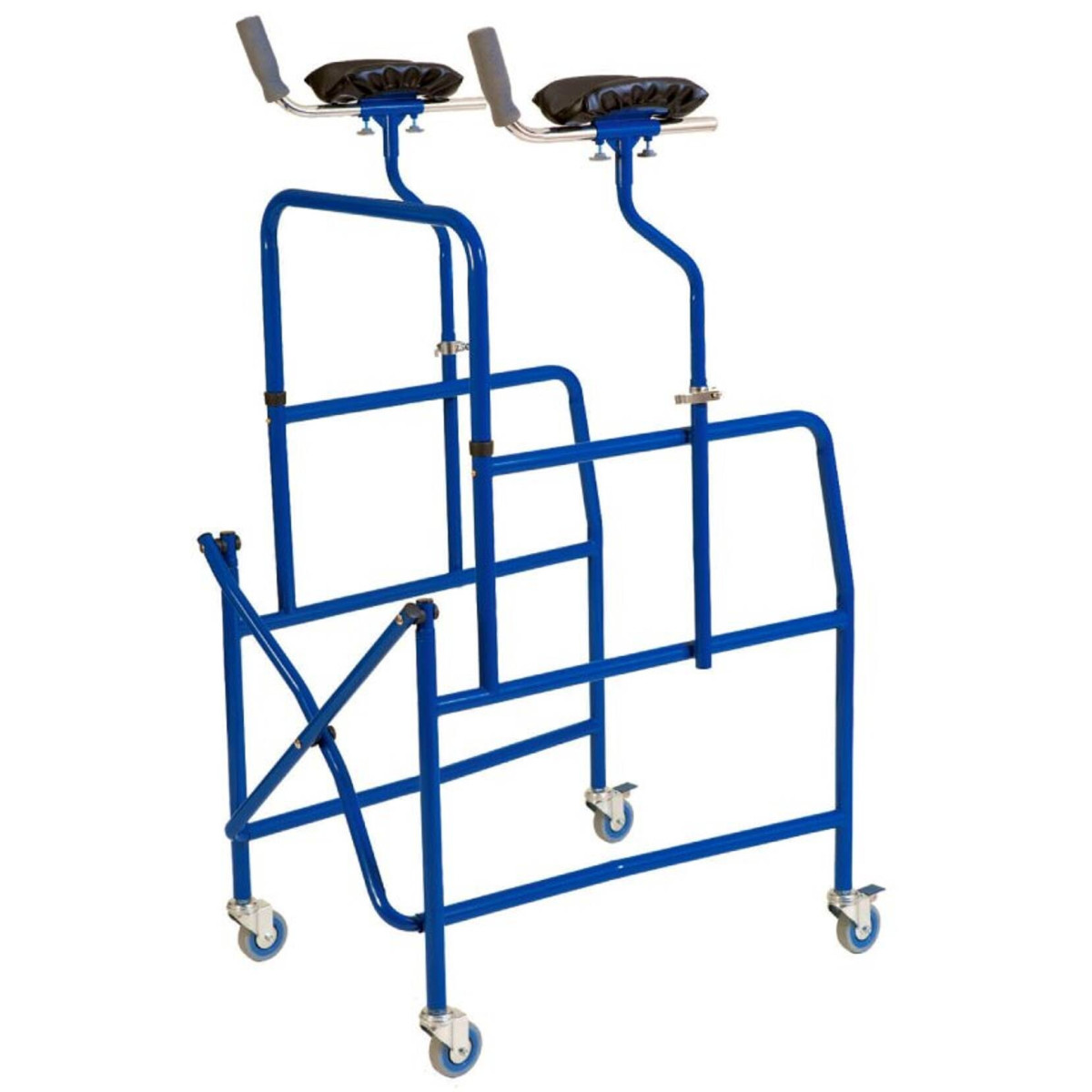 Il deambulatore pieghevole art.ParaDE1 è un ausilio tecnico progettato per chi necessita di un supporto stabile che permetta di scaricare il peso sugli avambracci. La struttura in acciaio verniciato blu è dotata di quattro ruote da 7,5 cm, con sistema di bloccaggio sulle posteriori. Gli appoggi antibrachiali sono realizzati in materiale morbido con rivestimento lavabile e possono essere regolati sia in altezza che in profondità per garantire una postura corretta.