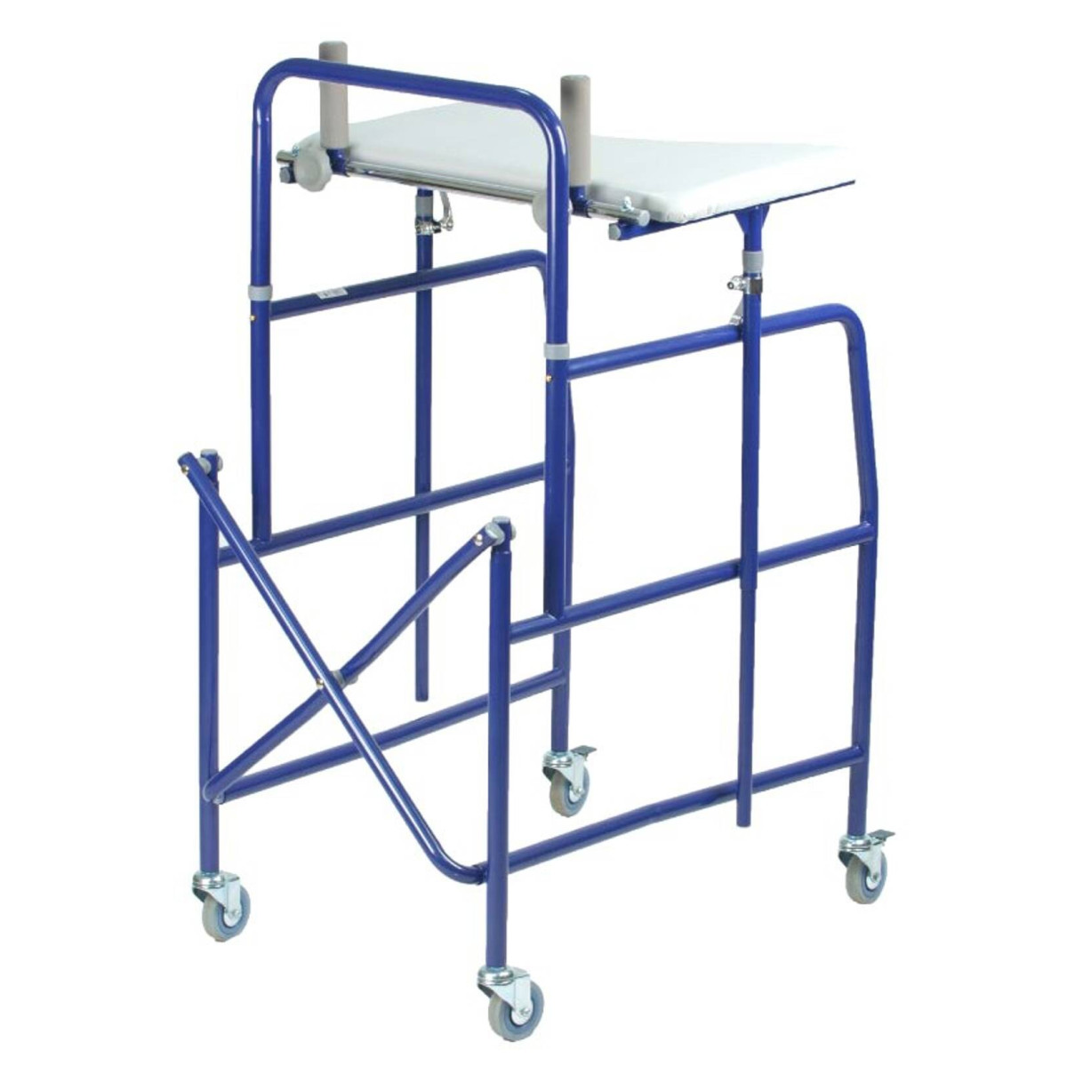 Il deambulatore pieghevole art.ParaDE1-T è un ausilio tecnico avanzato, caratterizzato da un tavolino imbottito regolabile in altezza che offre un appoggio frontale confortevole e sicuro. La struttura in acciaio verniciato blu è dotata di maniglie regolabili sia in larghezza che in inclinazione, rivestite in morbida gomma lavabile. Le quattro ruote piroettanti da 7,5 cm, con sistema di bloccaggio sulle posteriori, assicurano una mobilità fluida e controllata negli ambienti interni.