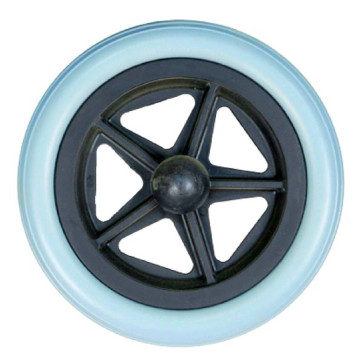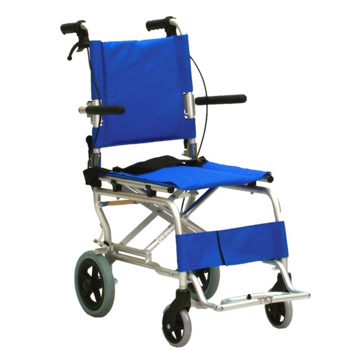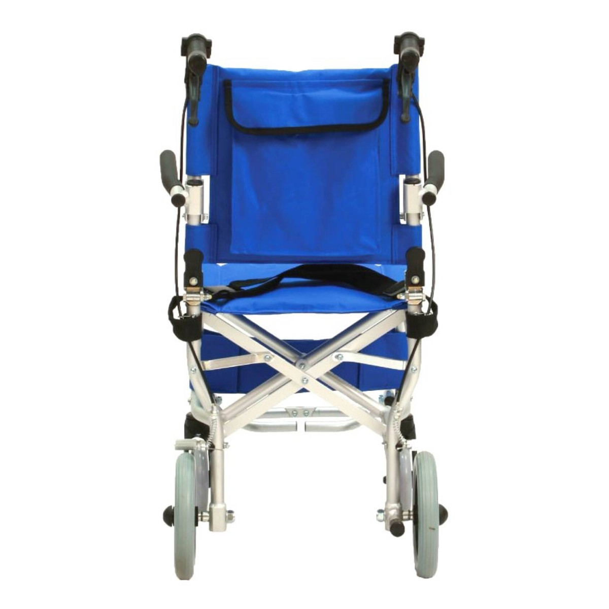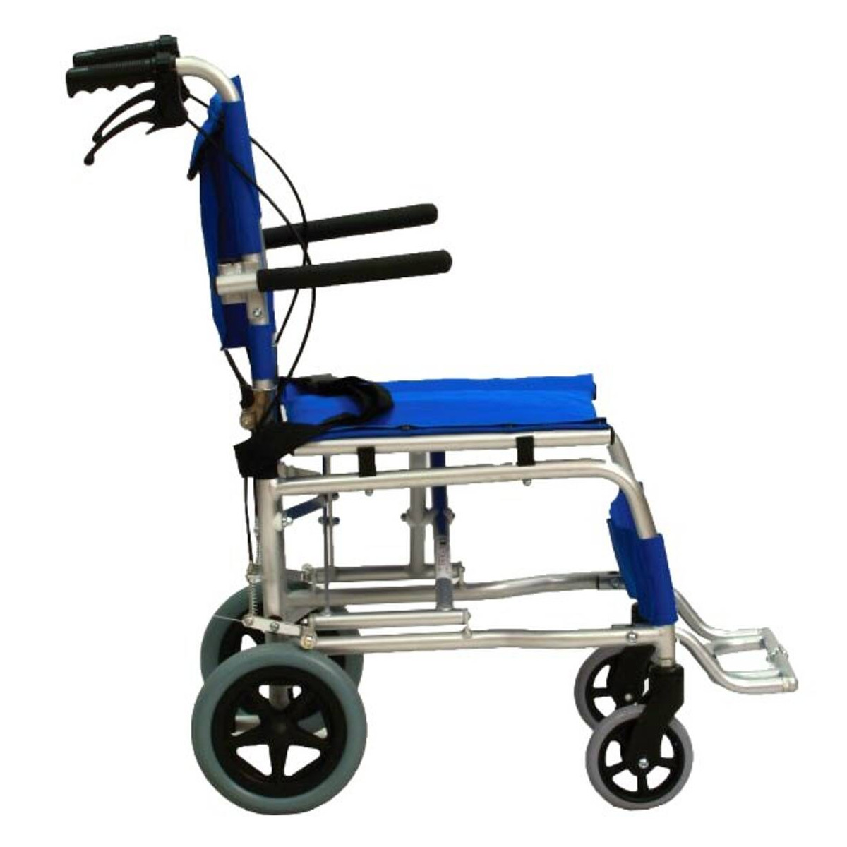 La sicurezza è garantita dai freni di rallentamento e bloccaggio azionabili direttamente dalle maniglie di spinta, dalla cintura di sicurezza e dal ferma-polpacci. I poggia braccia sono ribaltabili verso l'alto per agevolare i trasferimenti laterali, mentre le ruote piene assicurano un utilizzo senza manutenzione su diverse superfici.