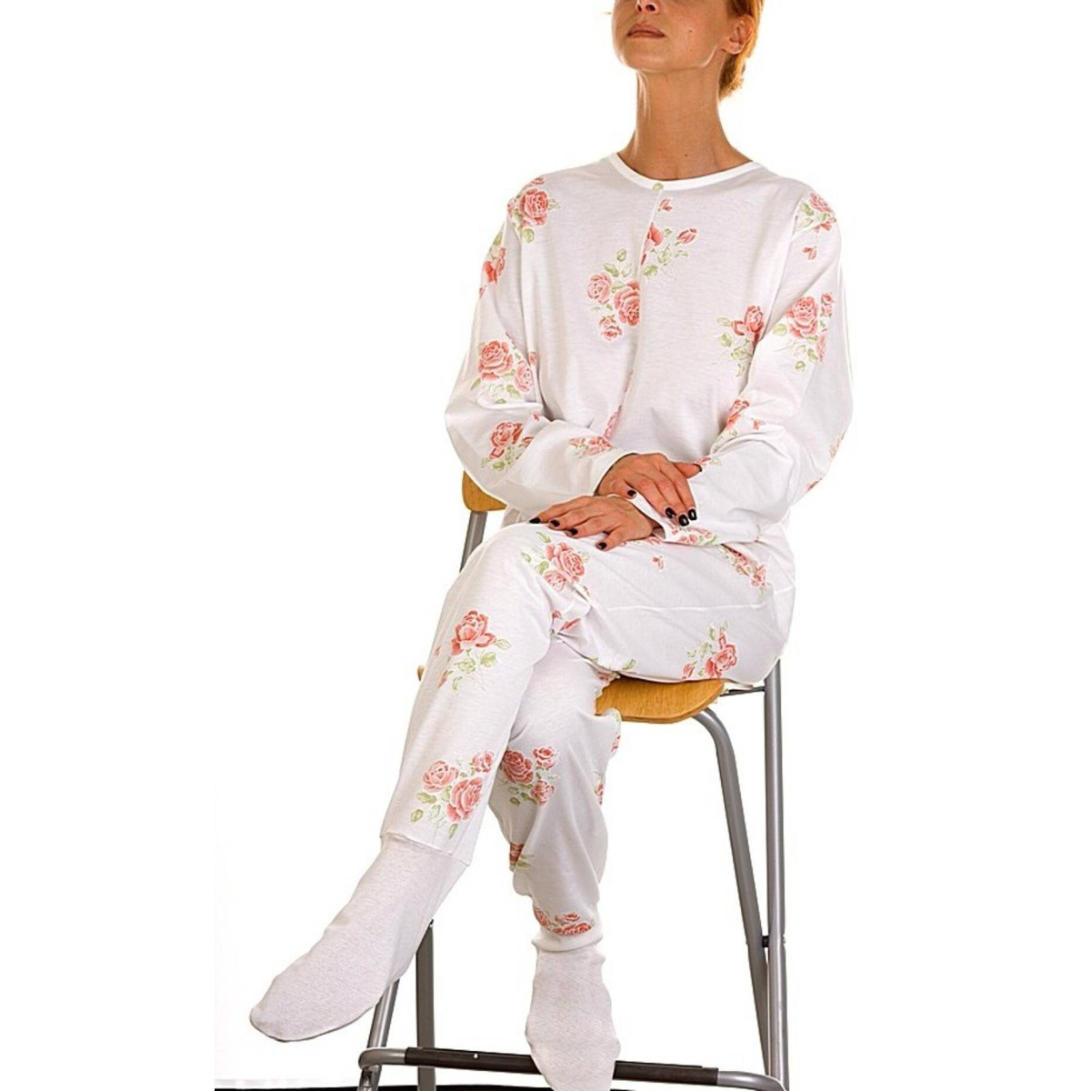 Il pigiama sanitario per donna Art. 1001-P è confezionato in morbido interlock di puro cotone, una scelta ideale per garantire calore e protezione durante i mesi invernali. Questo modello si distingue per l'inserimento di due calze in jersey elasticizzato integrate al fondo delle gambe: un accorgimento studiato con cura per impedire che il tessuto scivoli lungo gli arti e per inibire l'accesso al pannolone dall'orlo inferiore.