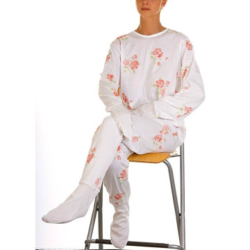 Il pigiama sanitario per donna Art. 1001-MP è realizzato in morbido caldo cotone (interlock), ideale per garantire il massimo comfort termico durante i mesi invernali o per Persone particolarmente sensibili al freddo. Questo modello offre una protezione completa grazie all'integrazione di guanti e calze in maglina di cotone elasticizzato, cuciti direttamente al termine di maniche e gambe.