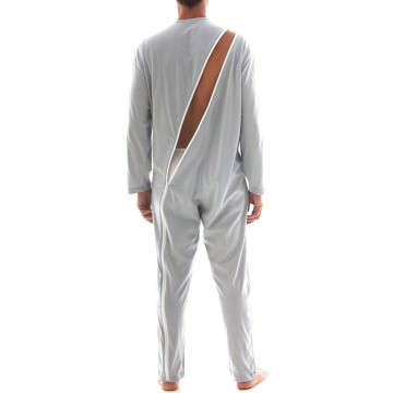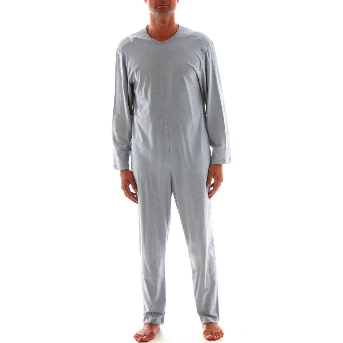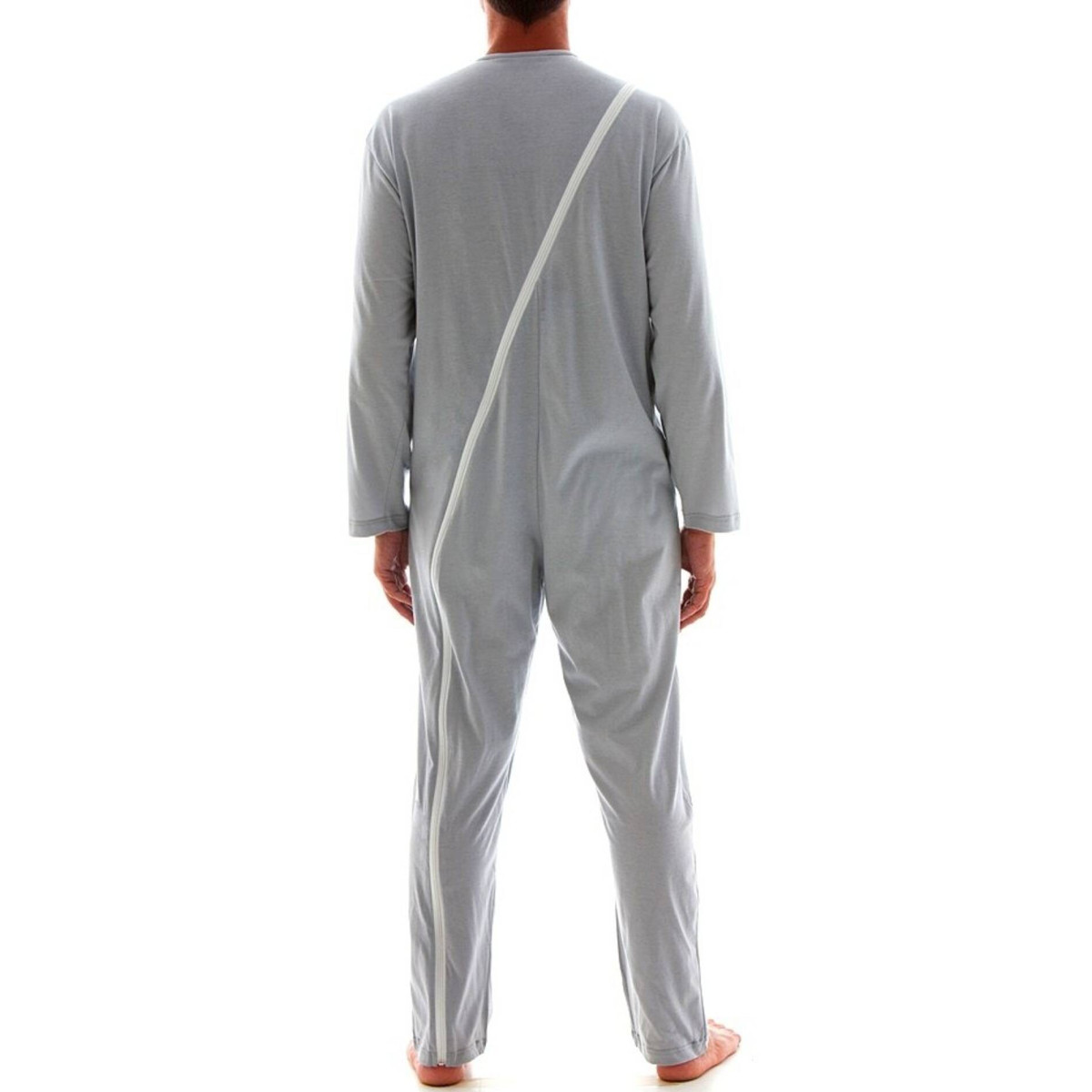 Il pigiama sanitario per uomo Art. 1042 è confezionato in jersey di puro cotone, un tessuto leggero e traspirante ideale per il periodo primaverile ed estivo. Questo modello si distingue per la particolare cerniera integrale che parte dal tallone, risale la gamba e la schiena, terminando anteriormente all'altezza della clavicola. Tale conformazione impedisce al Paziente ogni tentativo di apertura autonoma, garantendo la massima sicurezza contro lo svestimento o la manipolazione del pannolone.