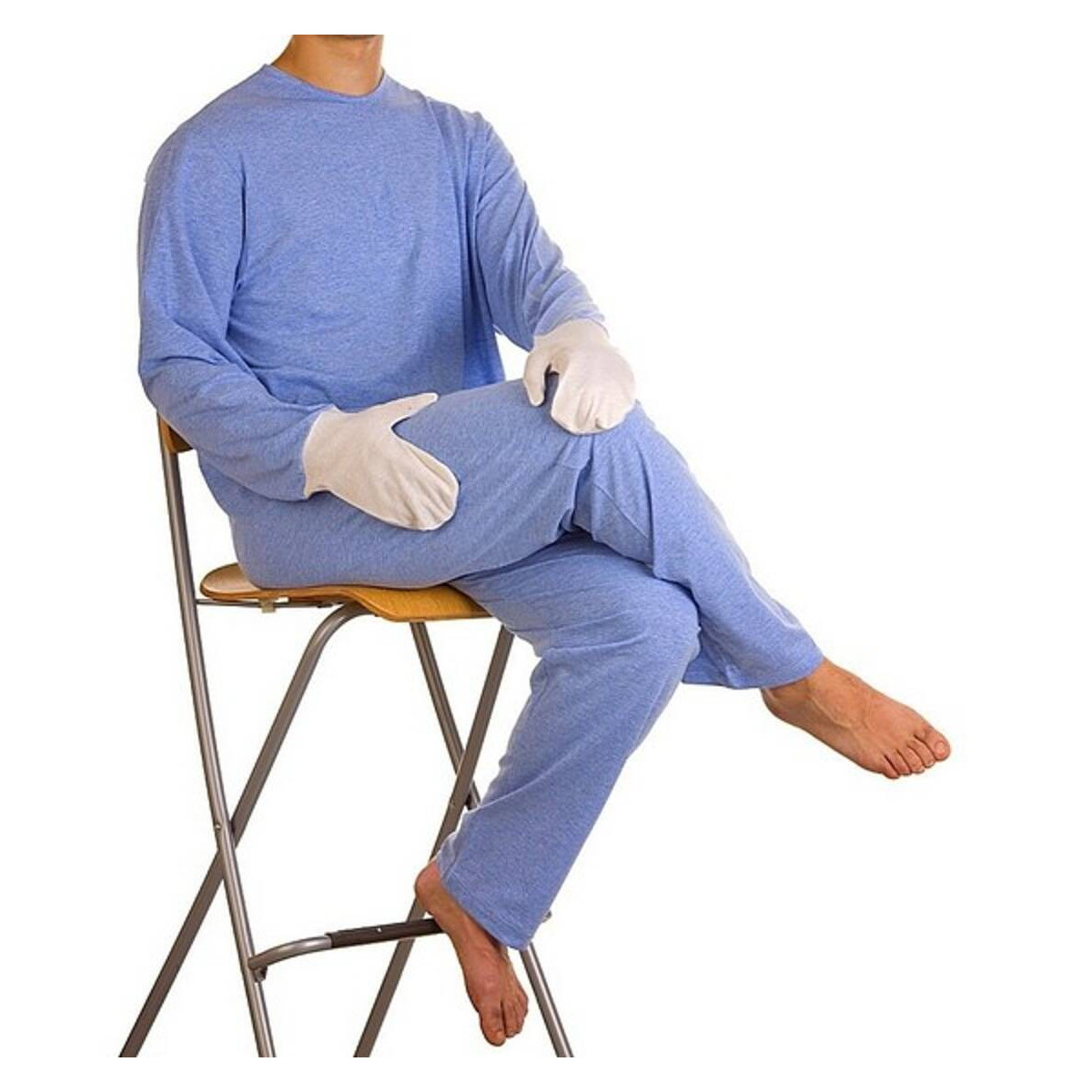 Il pigiama sanitario per uomo Art. 1003-M è realizzato in puro caldo cotone interlock, un tessuto morbido e termico ideale per le stagioni fredde. Questo modello integra al fondo delle maniche due guanti in maglina elasticizzata, studiati specificamente per impedire al Paziente di procurarsi lacerazioni della pelle o abrasioni grattandosi involontariamente.